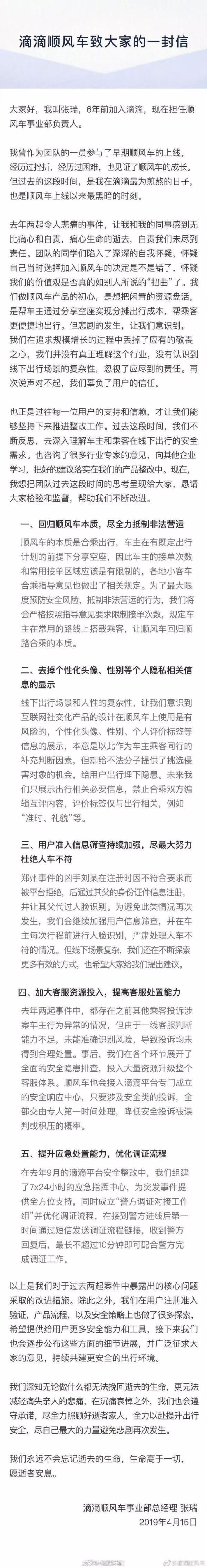 张瑞表示,过去这段时间,内部不断反思,去深入理解车主和乘客在线下出行的安全需求,也咨询了很多行业专家的意见,向其他企业学习,把好的建议落实在滴滴顺风车的产品整改中。其整改措施主要包括五项: