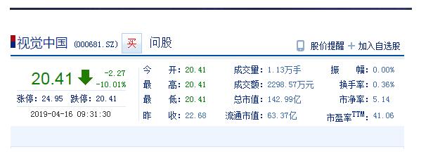 新浪科技讯 4月16日上午消息,视觉中国连续第三日跌停,报价20.41元,跌停封单超58万手,目前市值约143亿元。