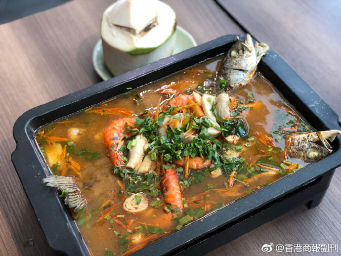 依照传统的冬荫功烹调手法,不加椰奶及忌廉,反而在上桌前才将整个椰青汁倒入,令原本酸辣的冬荫功汤,瞬间变得柔和顺口,配上鲜甜大虾及肉质细软的鲈鱼,汤头显得很鲜甜。