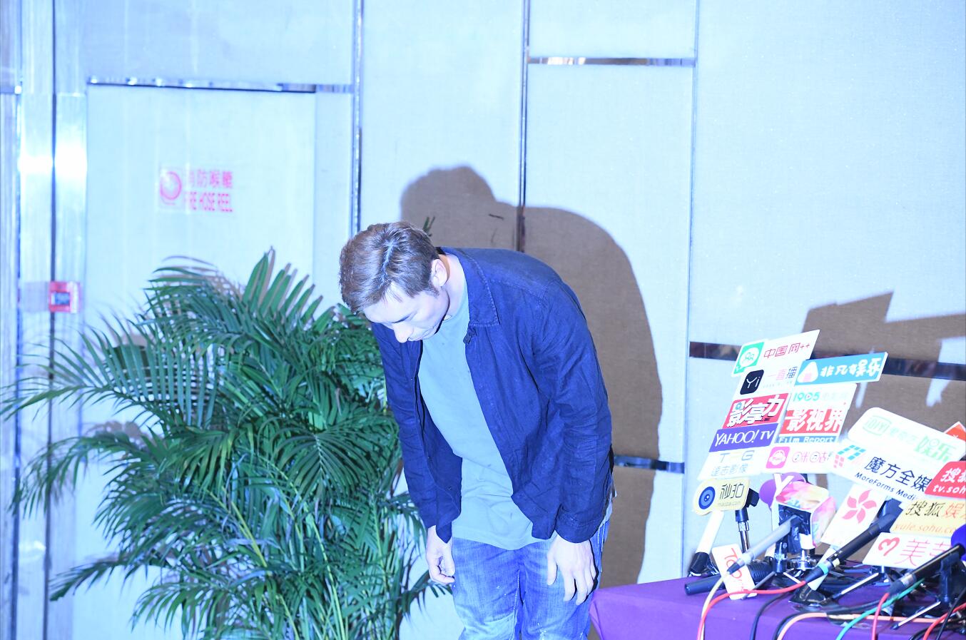 許志安晚上到銅鑼灣一酒店召開記者招待會交代出軌事件,他在離開前再次鞠躬道歉。(記者崔俊良攝)