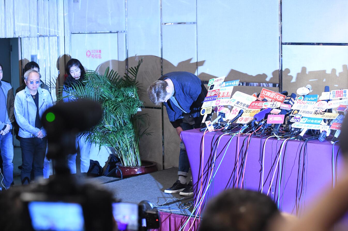 許志安晚上到銅鑼灣一酒店召開記者招待會交代出軌事件,他在發言前鞠躬道歉。(記者崔俊良攝)