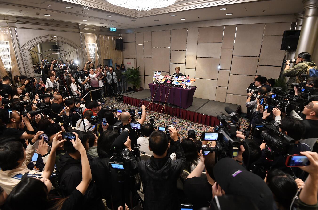 許志安晚上到銅鑼灣一酒店召開記者招待會交代出軌事件,現場有逾百傳媒訪攝。(記者崔俊良攝)