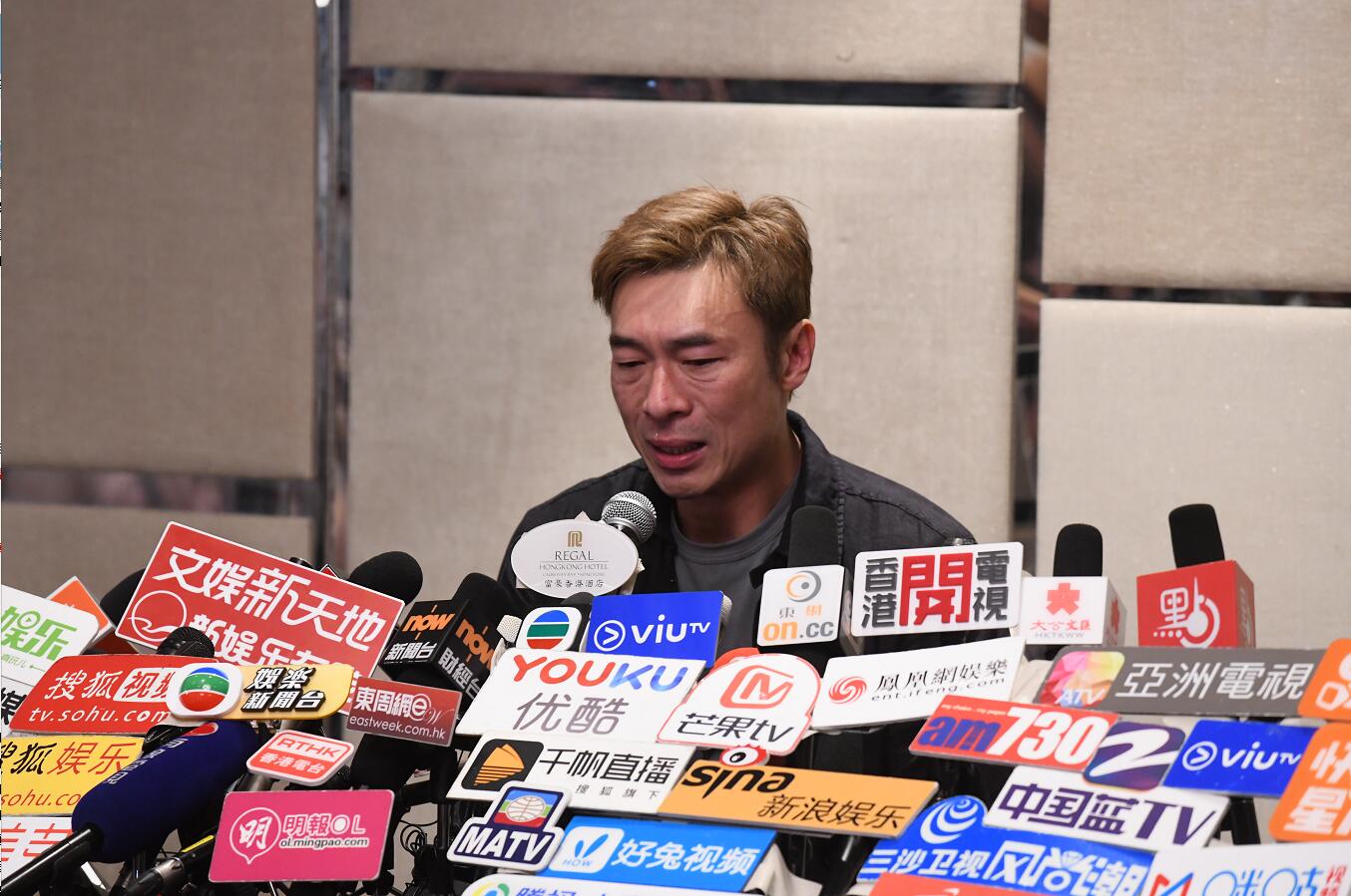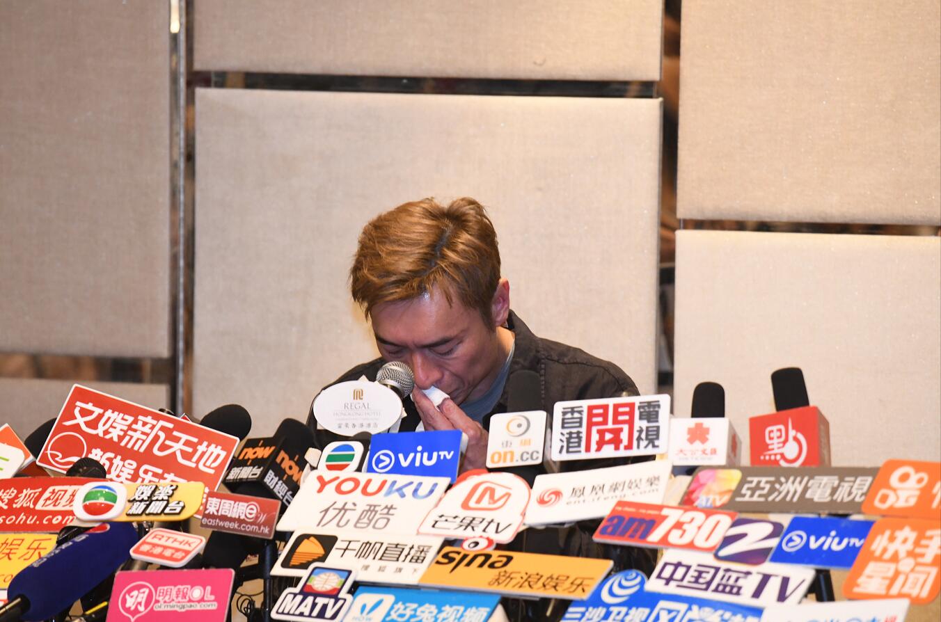 許志安晚上到銅鑼灣一酒店召開記者招待會交代出軌事件,他在發言時曾多番哽咽。(記者崔俊良攝)