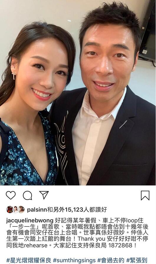 去年10月,黃心穎與許志安在「星光熠熠耀保良」上台拖手合唱歌曲。當晚,二人合唱後也有把合照上載互聯網。(黃心穎IG圖片)