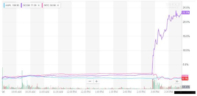 苹果在消息发布后股价波动,几次转跌,收盘微涨,报收199.25美元,接近2018年11月初以来最高。高通的竞争对手、苹果后期向其购买基带芯片的英特尔短线转跌,此前曾涨超2%,收涨0.76%但盘后下跌。