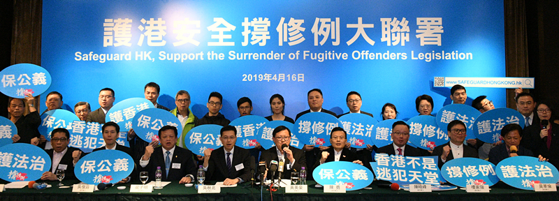 由多個界別人士組成的「萬人同聲撐修例公義組」,由律師黃英豪擔任召集人,經民聯立法會議員兼大律師梁美芬擔任顧問。副召集人包括工聯會會長吳秋北、新界社團聯會理事長陳勇、高鋒集團主席吳傑莊、香港中華廠商聯合會永遠名譽會長施榮懷、律師陳曉峰、著名歌唱家莫華倫等。該會表明支持特區政府修訂《逃犯條例》,並會舉辦「護港安全撐修例大聯署」,市民昨日起已可到網站「www.safeguardhongkong.hk」參與。