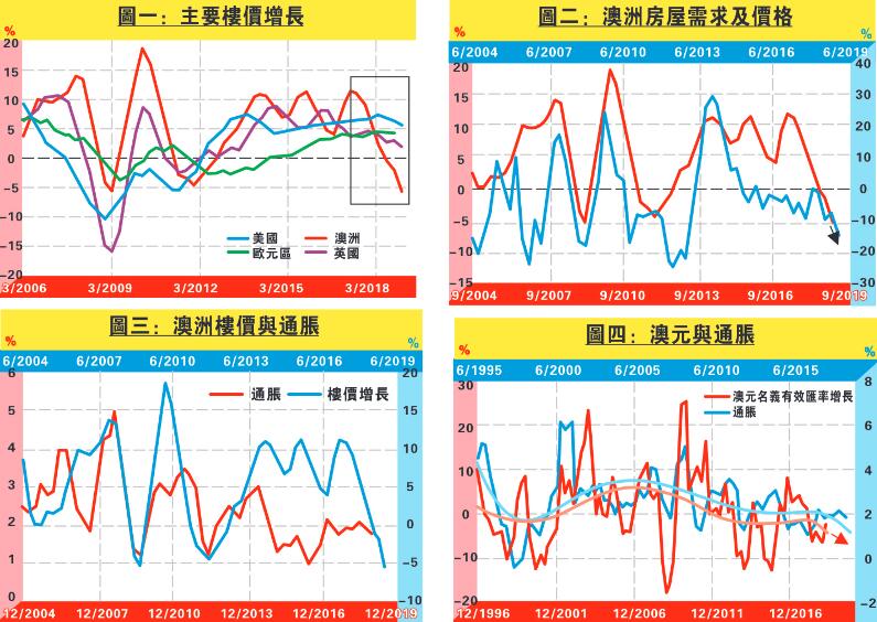 樓價佔通脹比例最重,而綜觀全球主要樓市(圖一),可見美、歐、英、澳的樓價增長自2011年開始抽升,並於去年才略見放緩,但美國樓價增長仍在高位靠穩。然而自2006年起,澳洲樓價增長大部分時間均高於其他國家,不過自2017年第四季開始回落,而跌勢最為急速,更遜於金融海嘯時。