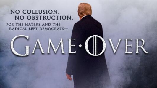 特朗普在司法部长巴尔的记者会结束后,随即在推特上发布一张电视剧《权力的游戏》风格的照片,照片上写着,“不存在勾结、不存在阻碍司法公正,对于仇恨者和左派民主党人来说,游戏结束了。”随后特朗普在白宫出席活动时又重申,报告证实他没有同俄罗斯勾结,也没有妨碍司法公正。