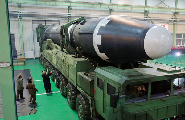 2017年4月,金正恩視察朝鮮核武器研究所最新研發的洲際彈道導彈。 資料圖片