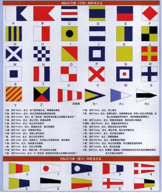 不同的旗帜组合悬挂,又有特定的含义,如前文所述“RU1”,又如“AE”意为“我必须弃船”,“BB”意为“你(直升机)可以降落在我的甲板上”。
