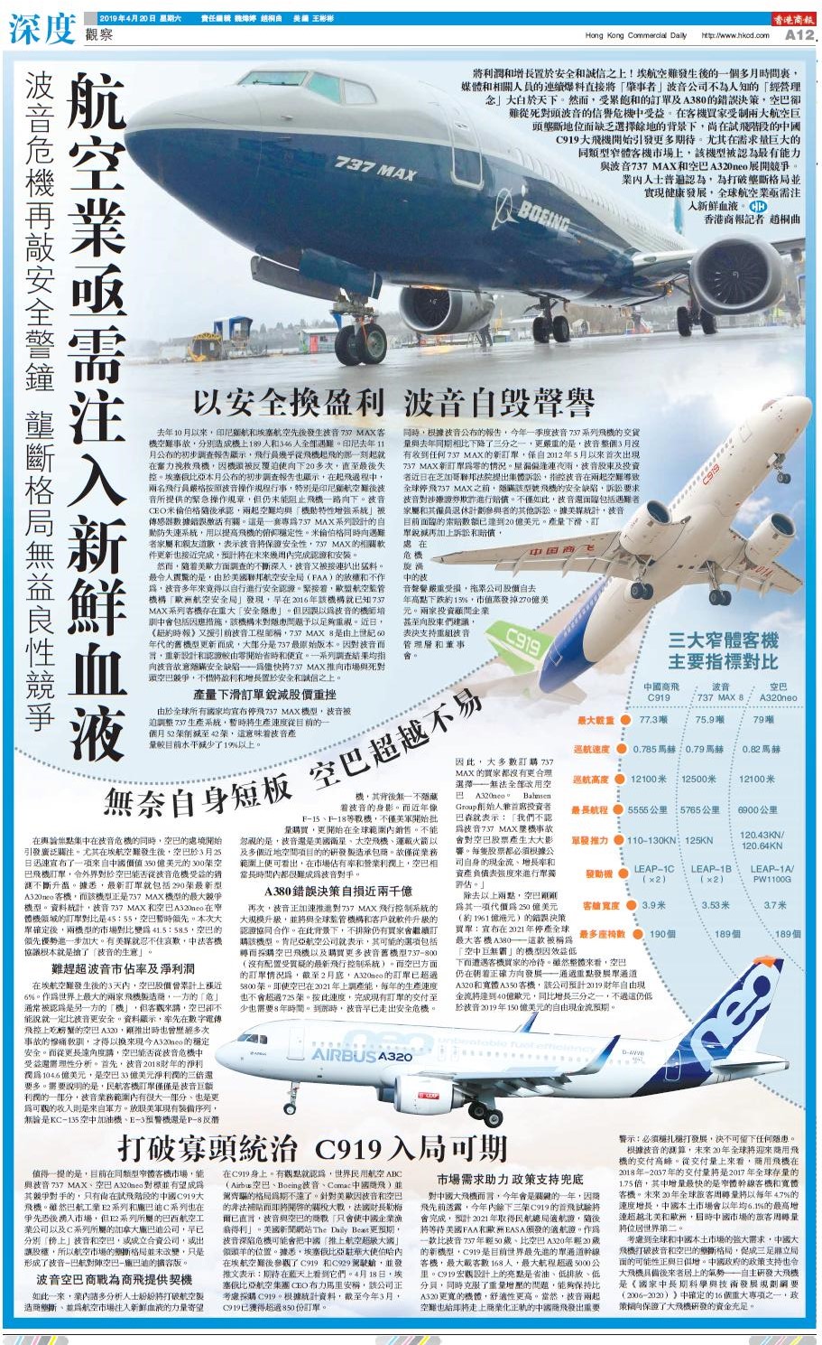 將利潤和增長置於安全和誠信之上!埃航空難發生後的一個多月時間裏,媒體和相關人員的連續爆料直接將「肇事者」波音公司不為人知的「經營理念」大白於天下。然而,受累飽和的訂單及A380的錯誤決策,空巴卻難從死對頭波音的信譽危機中受益。在客機買家受制兩大航空巨頭壟斷地位而缺乏選擇餘地的背景下,尚在試飛階段的中國C919大飛機開始引發更多期待。尤其在需求量巨大的同類型窄體客機市場上,該機型被認為最有能力與波音737 MAX和空巴A320neo展開競爭。業內人士普遍認為,為打破壟斷格局並實現健康發展,全球航空業亟需注入新鮮血液。