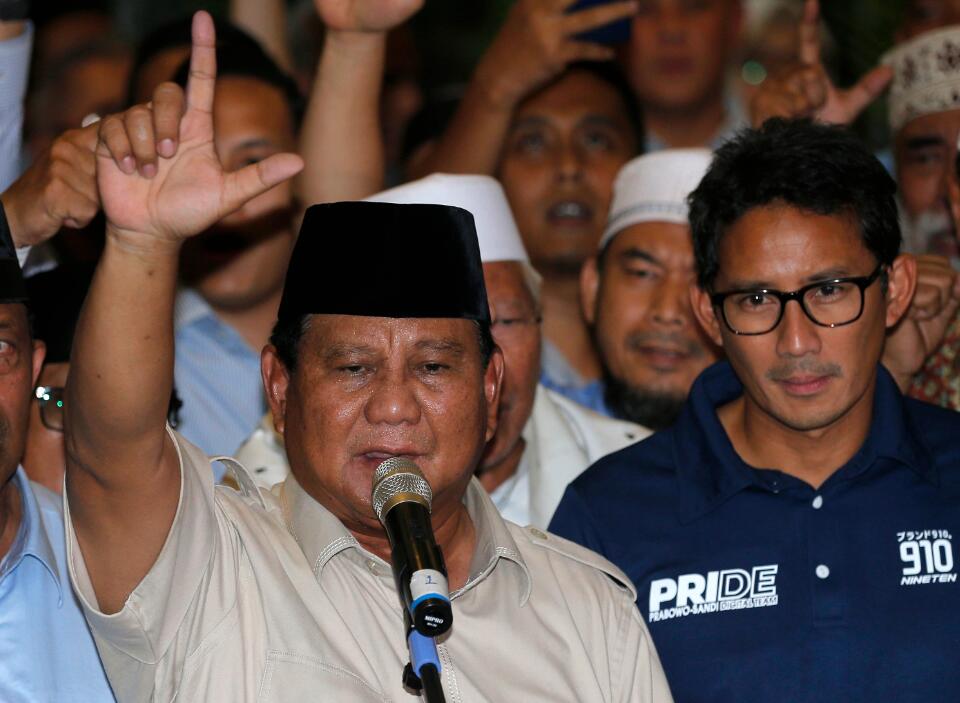 維多多的競選對手蘇比安托(左)攜拍檔烏諾宣布勝選。 新華社