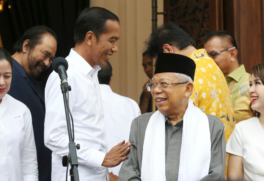 印尼現任總統維多多(左)和競選拍檔阿明18日在雅加達出席新聞發布會。 新華社