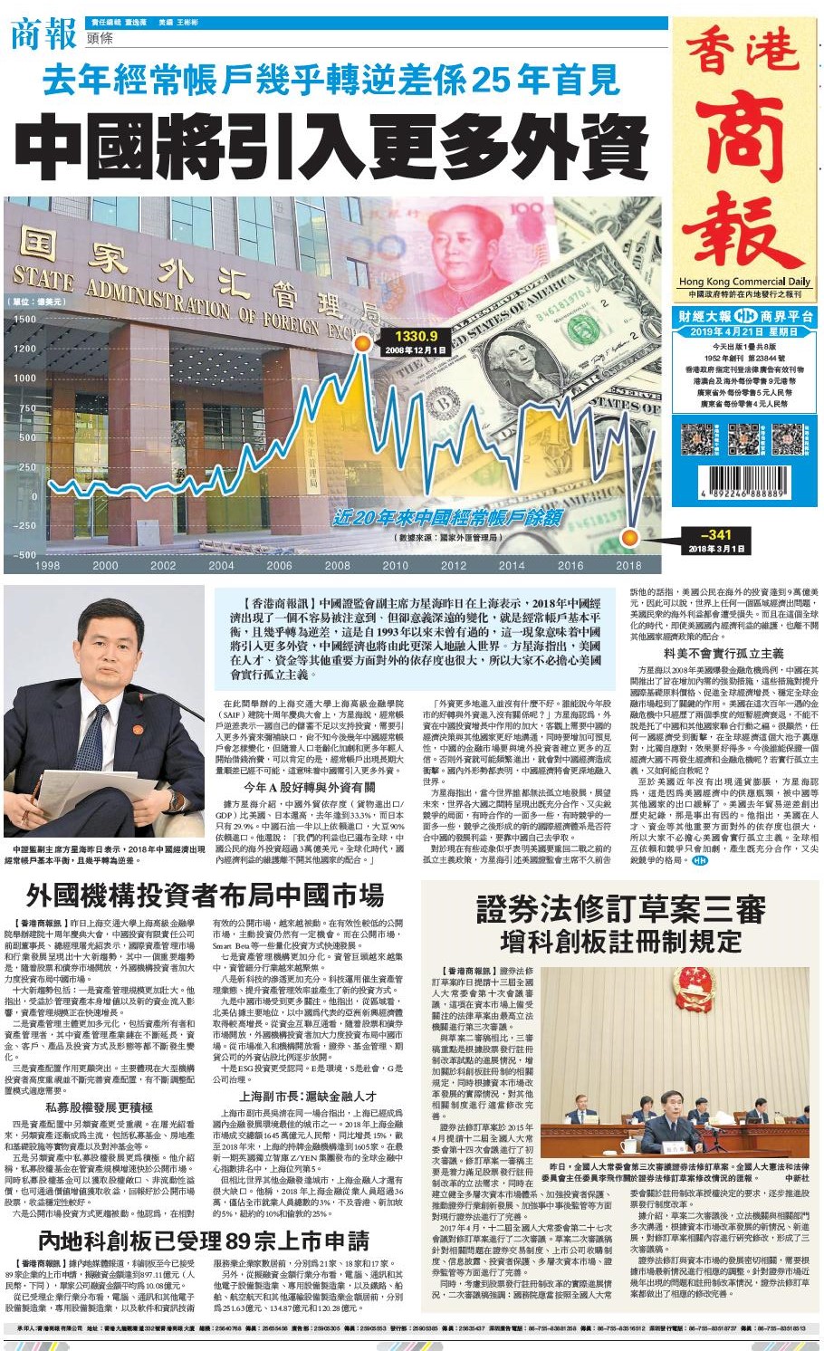 中證監副主席方星海昨日表示,2018年中國經濟出現經常帳戶基本平衡,且幾乎轉為逆差。