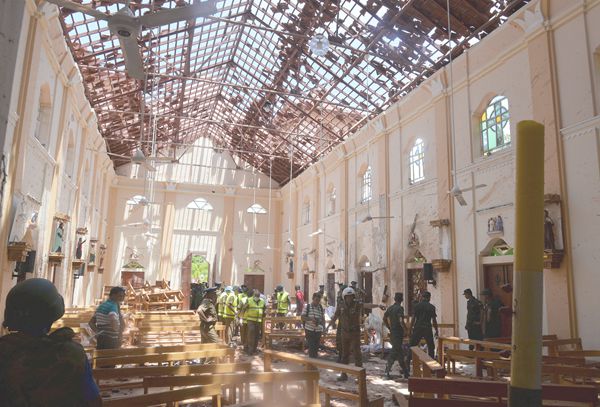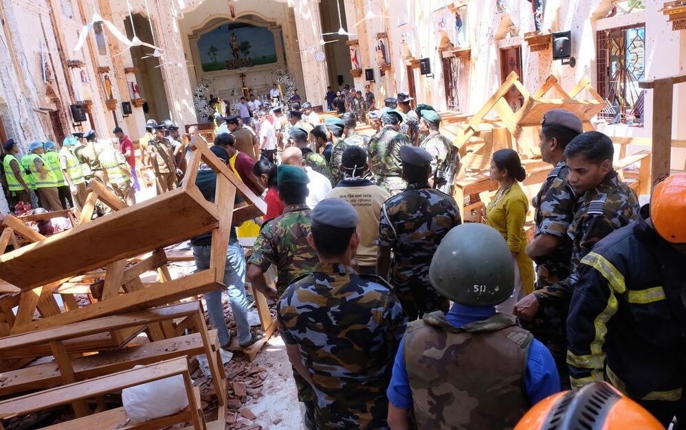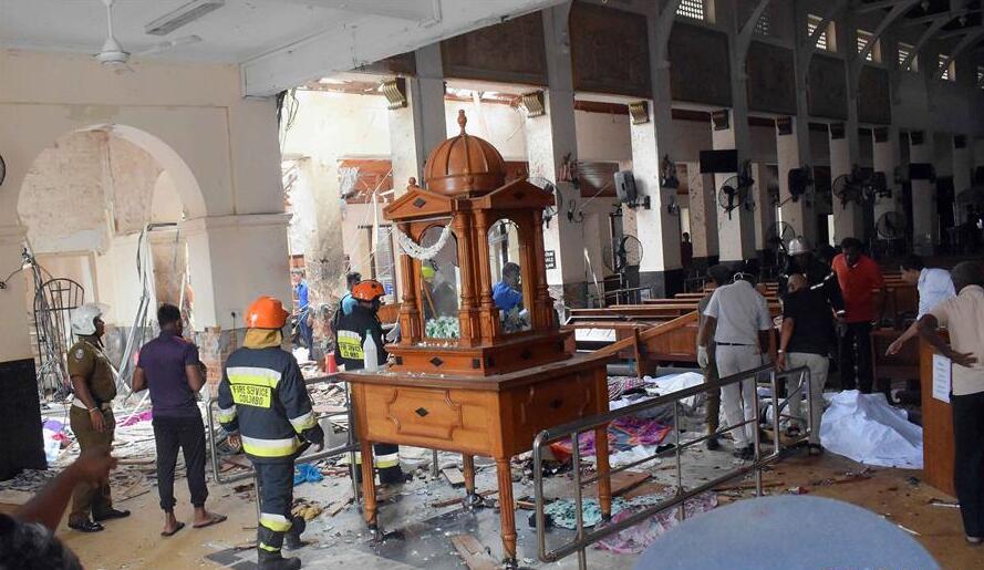 4月21日,在斯里兰卡首都科伦坡,人们在遭爆炸袭击的圣安东尼教堂内工作。新华社