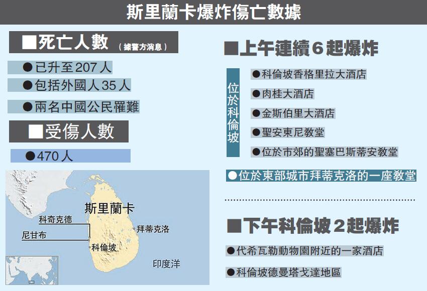 【香港商报网讯】記者郭志文报道:斯里蘭卡復活節一天驚現8起連環爆炸!斯警方昨證實,首都科倫坡及周邊地區3所天主教教堂和3家豪華酒店當天幾乎同一時間遭到炸彈襲擊。稍後,科倫坡又發生2起爆炸。据路透社援引斯里兰卡警方发言人报道,连环爆炸案已造成290人死亡,其中包括2名中國公民在內的35名外國人,约500人受伤。另外,警方已逮捕了24名嫌犯;暫無組織宣稱對是次爆炸負責。