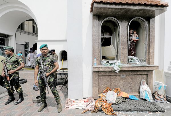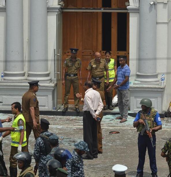 4月21日,在斯里兰卡科伦坡,安全人员聚集在发生爆炸的圣安东尼教堂外。 新华社