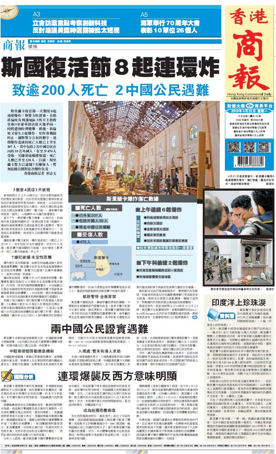 本港入境事務處昨表示,入境處獲悉事件後已即時透過外交部駐港特派員公署、中國駐斯里蘭卡大使館及香港旅遊業議會了解情況,至今並未接獲港人求助。目前,共有兩個香港旅行團身處斯里蘭卡。旅遊業議會主席黃進達表示,兩個旅行團共22人全部安全,正在當地的堅地及獅子岩觀光,行程未受影響。原定出發前往當地的一個旅行團目前已決定取消。