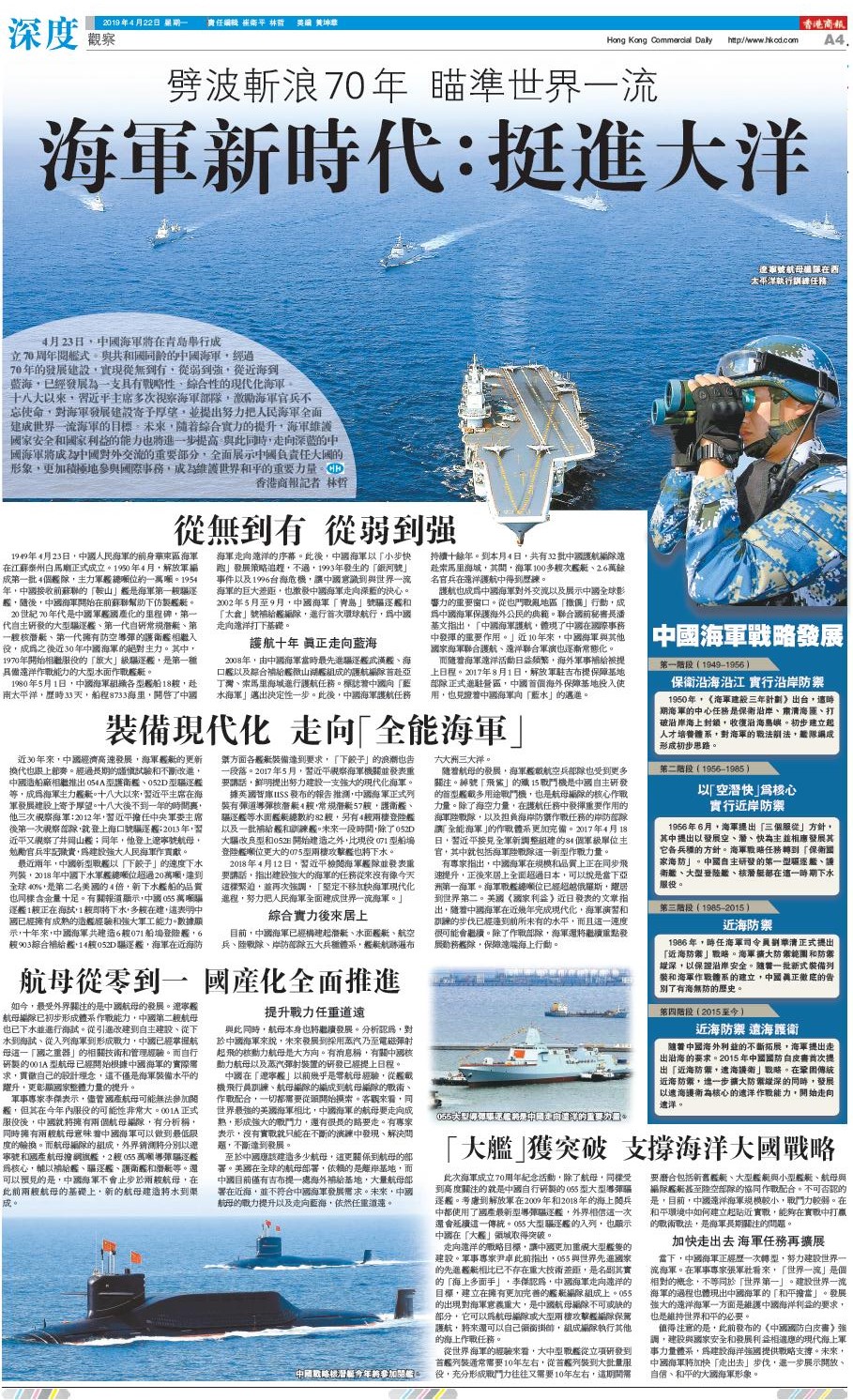 【香港商报网讯】4月23日,中國海軍將在青島舉行成立70周年閱艦式。與共和國同齡的中國海軍,經過70年的發展建設,實現從無到有,從弱到強,從近海到藍海,已經發展為一支具有戰略性、綜合性的現代化海軍。十八大以來,習近平主席多次視察海軍部隊,激勵海軍官兵不忘使命,對海軍發展建設寄予厚望,並提出努力把人民海軍全面建成世界一流海軍的目標。未來,隨着綜合實力的提升,海軍維護國家安全和國家利益的能力也將進一步提高。與此同時,走向深藍的中國海軍將成為中國對外交流的重要部分,全面展示中國負責任大國的形象,更加積極地參與國際事務,成為維護世界和平的重要力量。香港商報記者 林哲