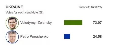 于是,最终的结果便是从没当过总统,没有从政经验的喜剧演员获得了73.07%的选票,而做了5年总统的,更在乌克兰政坛摸爬滚打了多年的现任总统波罗申科,只获得了24.58%的选票。