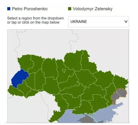 下面这张英国BBC制作的选情地图更是直观地反映了乌克兰的“民心所向”:全国所有选区几乎都投票给了泽伦斯基,波罗申科则只获得了可怜的一处支持……