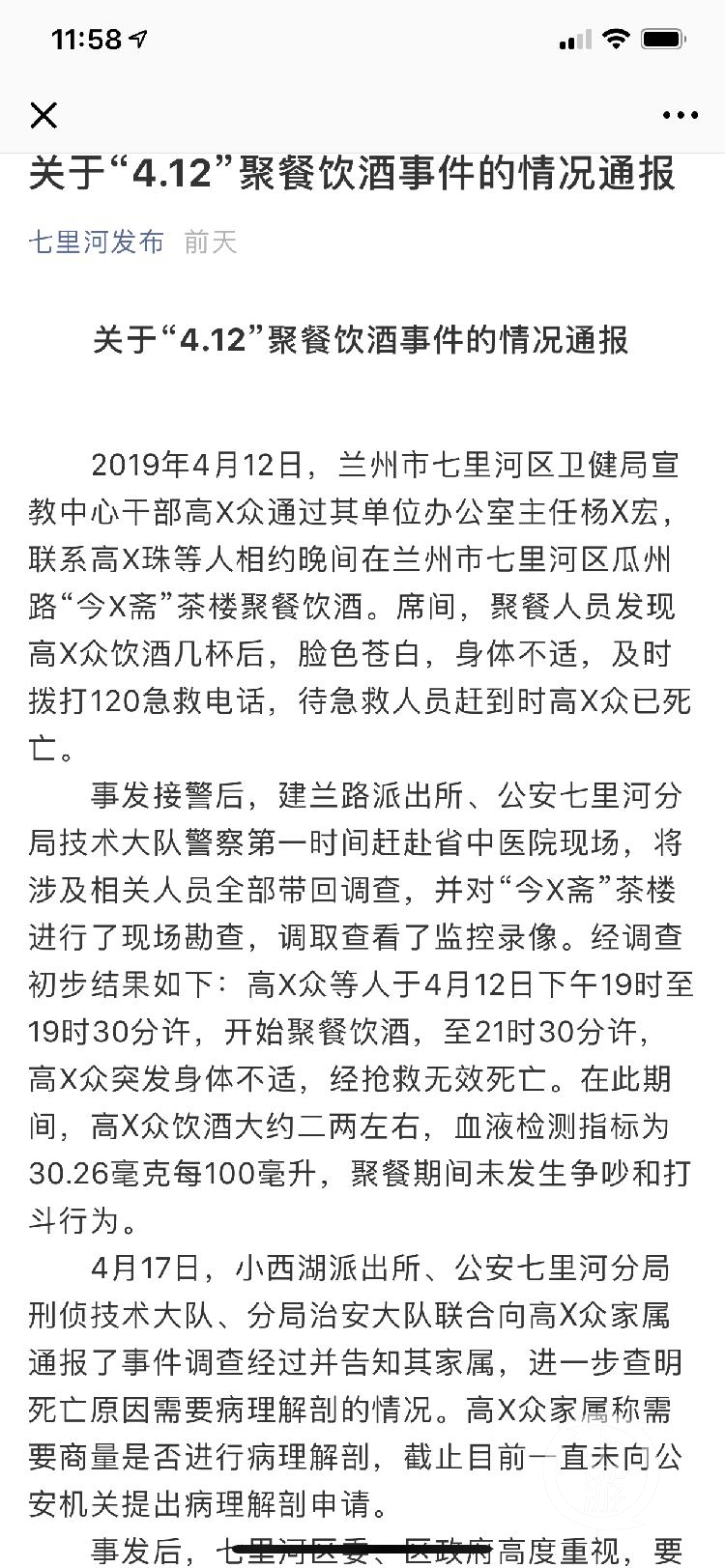 本月中旬,甘肃兰州市七里河区卫健局宣教中心干部高某众,在与7人聚餐中喝酒后死亡。