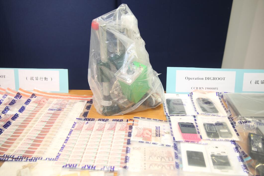 圖為檢獲的偽鈔和製造工具。 記者 區天海攝