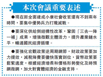 會議指出,總體而言,中國已經基本實現全面建成小康社會目標。目前,全面建成小康社會也有一些短板,必須加快補上。同時強調,現在距全面建成小康社會收官還有不到兩年時間,要集中優勢兵力打殲滅戰。要全面完成脫貧攻堅任務,把扶貧工作重心向深度貧困地區聚焦,在普遍實現「兩不愁」的基礎上,重點攻克「三保障」面臨的最後堡壘。要解決好重點地區環境污染突出問題,打好污染防治攻堅戰,實現到2020年的階段性目標。要加快民生領域工作推進,加大對義務教育、基本醫療、住房和飲水安全、育幼養老等方面投入,解決好部分群眾急迫的現實問題。要健全社保兜底機制,完善最低生活保障制度,實現應保盡保,確保兜住基本生活底線。各地發展水平有差異,全面建成小康社會收官階段的工作也應各有側重。既要為全面建成小康社會跑好「最後一公里」,又要乘勢而上開啟全面建設社會主義現代化國家新征程,實現「兩個一百年」奮鬥目標有機銜接。