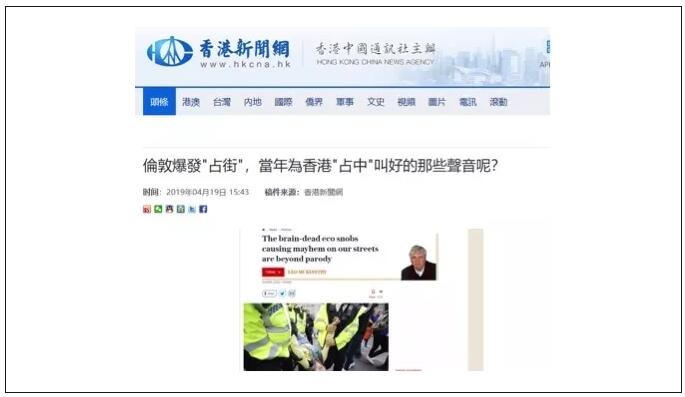 而香港新闻网一篇名为【伦敦爆发“占街”,当年为香港“占中”叫好的那些声音呢?】的文章中,讽刺包括英国以及美国媒体在内的一众西方媒体对香港违法占中大唱“赞歌”,可对于英国政府逮捕他们“占中分子”的行为却保持沉默。