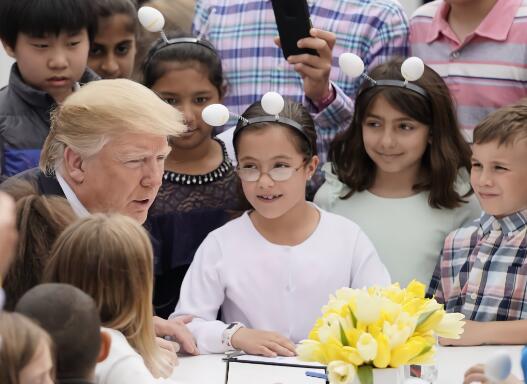 4月22日,白宫举行一年一度的复活节滚彩蛋活动,特朗普陪同孩子们进行游戏。