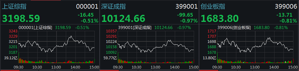 截至收盘,沪指报3198.59点,跌幅0.51%,成交额3248.70亿;深成指报10124.66点,跌幅0.97%,成交额4081.41亿;创业板指报1683.80点,跌幅0.81%,成交额1050.43亿。