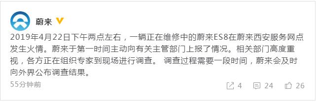 2019年4月22日下午两点左右,一辆正在维修中的蔚来ES8在蔚来西安服务网点发生火情。蔚来于第一时间主动向有关主管部门上报了情况。相关部门高度重视,各方正在组织专家到现场进行调查。 调查过程需要一段时间,蔚来会及时向外界公布调查结果。