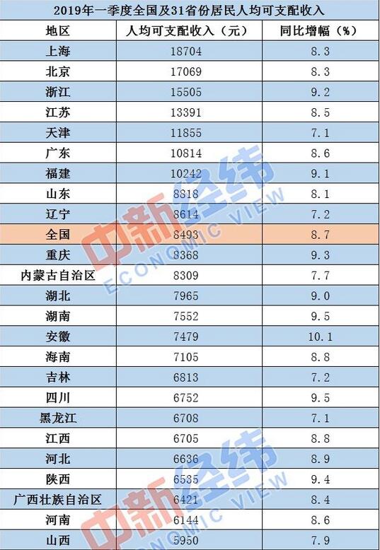 近日,国家统计局陆续公布2019年一季度全国及各省居民人均可支配收入数据。数据显示,一季度全国居民人均可支配收入为8493元,比上年同期名义增长8.7%,扣除价格因素后实际增长6.8%。