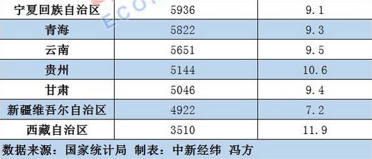 数据显示,榜单最后几位多为西部省份。不过,尽管人均收入水平较低,西部省份同比增速则普遍较高。31个省份中同比增速超过10%的地区有两个位于西部,甘肃、云南、青海等地同比增速也均超过9%。