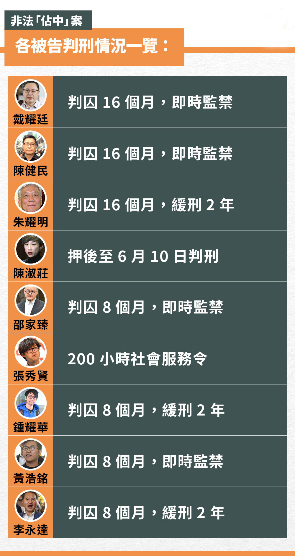 非法「佔中」其中两名发起人戴耀廷及陈健民的第一项控罪「串谋公众妨扰」,判即时入狱16个月;第二项控罪「煽惑他人煽惑公众妨扰」,判监8个月,同期执行,即是两人各合共监禁16个月,需即时入狱。另一名发起人朱耀明,同样因「串谋公众妨扰」罪,判监16个月,但获缓刑2年。