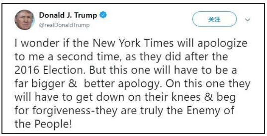 他又发推称,“我不知道《纽约时报》会不会像2016年选举后那样,第二次向我道歉。但这次必须是一个更大更好的道歉”,“他们不得不跪下来求我原谅,真是全民公敌!(the Enemy of the People)”。