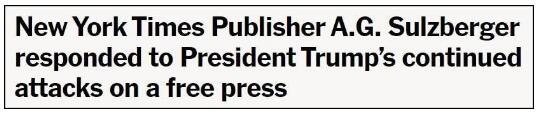 《纽约时报》公关账号(@NYTimes Communications)回应了特朗普推文,同时引用了其出版商亚瑟·苏兹贝格(Arthur Gregg Sulzberger)2月份回应特朗普的声明。