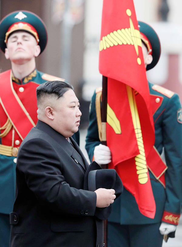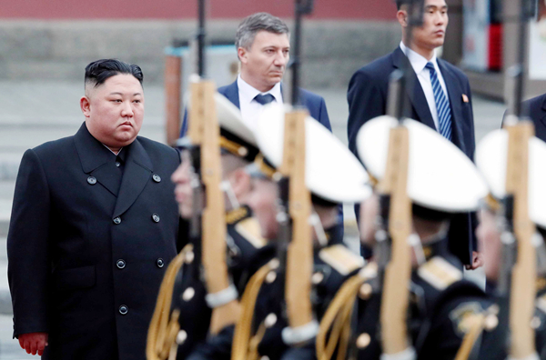 朝鮮最高領導人金正恩昨日下午抵達符拉迪沃斯托克火車站,隨後檢閱了俄方軍樂隊與儀仗隊。路透社