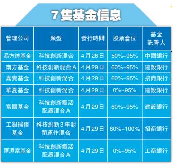 具體來看,易方達科技創新混合型證券投資基金將率先於明日啟動發行,而其餘6隻產品——華夏科技創新混合型證券投資基金,嘉實科技創新混合型證券投資基金,南方科技創新混合型證券投資基金,富國科技創新靈活配置混合型證券投資基金,匯添富科技創新靈活配置混合型證券投資基金,工銀瑞信科技創新3年封閉運作混合型證券投資基金則將在下周一開售。