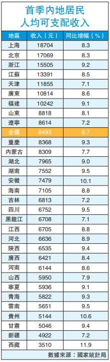 具體而言,排名首位的上海一季度居民人均可支配收入達到18704元,同比增長8.3%;北京以17069元緊隨其後,同比增速與上海持平;浙江為15505元,同比增長9.2%。