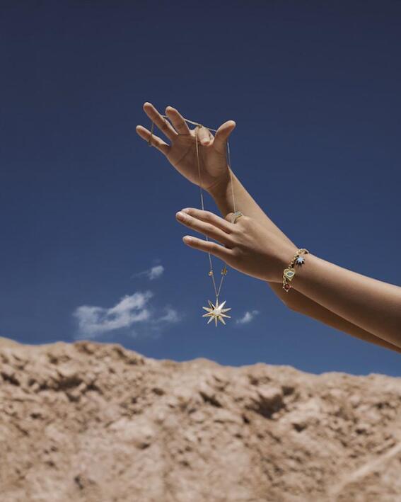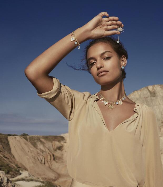 全新的春季系列靈感來源於人潮擁擠的摩洛哥市集,為呼應主題,自然隨處可見金色、赤褐色和大地粉色等暖色調,而最大賣點落在將地中海文化轉化成精緻且充滿趣味的吊飾,如象徵幸運、愛情、健康、成長、積極、力量或簡約風的符號。如洋溢摩洛哥風情的 Lucky Goddess系列,以清新手法詮釋經典符號的設計,帶有如瀑布瀉下的珊瑚色和翠藍色水晶吊飾,並糅合別致的金色金屬裝飾,別具復古風味。適合日常配搭的Olive單品,全新的爪鑲工藝與自然色調,令人想起沙灘與大海,透過 Swarovski水晶營造出猶如陽光四射的燦爛圖案。Oxygen以抽象概念演繹神秘魅力的惡魔之眼圖案,水晶混合金屬色調與亮藍色密鑲,璀璨炫目。至於Naeli系列則是採用白色和彩藍色的長方形切割 Swarovski 水晶,配以典雅的圓形輪廓,推介此系列的特大條形耳環及 Y 形項鏈,設計簡約得來又別具一格。