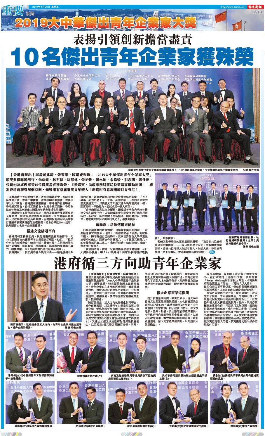 中聯辦青年工作部部長陳林、商務及經濟發展局署理局長陳百里、民政事務局副局長陳積志、立法會議員謝偉銓、民政事務局前局長藍鴻震、香港商報常務副社長兼執行總編輯張寶興等擔任主禮嘉賓,社會各界近200人出席,熱烈祝賀10名青年企業家獲獎。