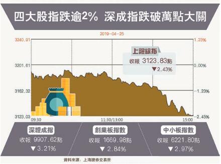 截至收盤,上證綜指報3123點,跌幅2.43%,成交3091億元人民幣;深證成指報9907點,跌幅3.21%,成交4243億元;中小板指報6221點,跌2.97%;創業板指報1669點,跌幅2.84%。