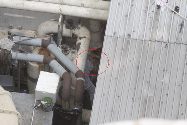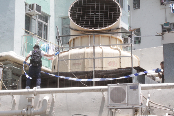 昨日上午10時許,上址有工人報警指,發現一具赤裸屍體,警方接報大為緊張,逾8輛衝鋒車趕抵到場調查,警員在酒樓平台上一組冷氣機通風槽的明渠下,尋獲該具女屍,遂將酒樓及平台封鎖,稍後在距伏屍位置約20呎外地上,再發現大灘血漬,不排除為女死者流下的血漬。