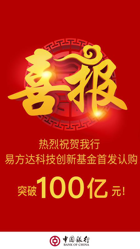 根據公告,「易方達科技創新混合基金」(代碼:007346)於4月26日通過中國銀行發行。當天下午4點左右,中國銀行已經發布該基金募集超百億的海報。根據合同約定,該基金首次募集規模上限為10億元人民幣,募集過程中達到10億元的,基金提前結束募集。在募集期內任何一天(含第一天)當日募集截止時間後認購申請金額超過10億元,基金管理人將採取末日比例確認的方式實現規模的有效控制。也就是說,該基金將啟動配售,配售比例不足10%。