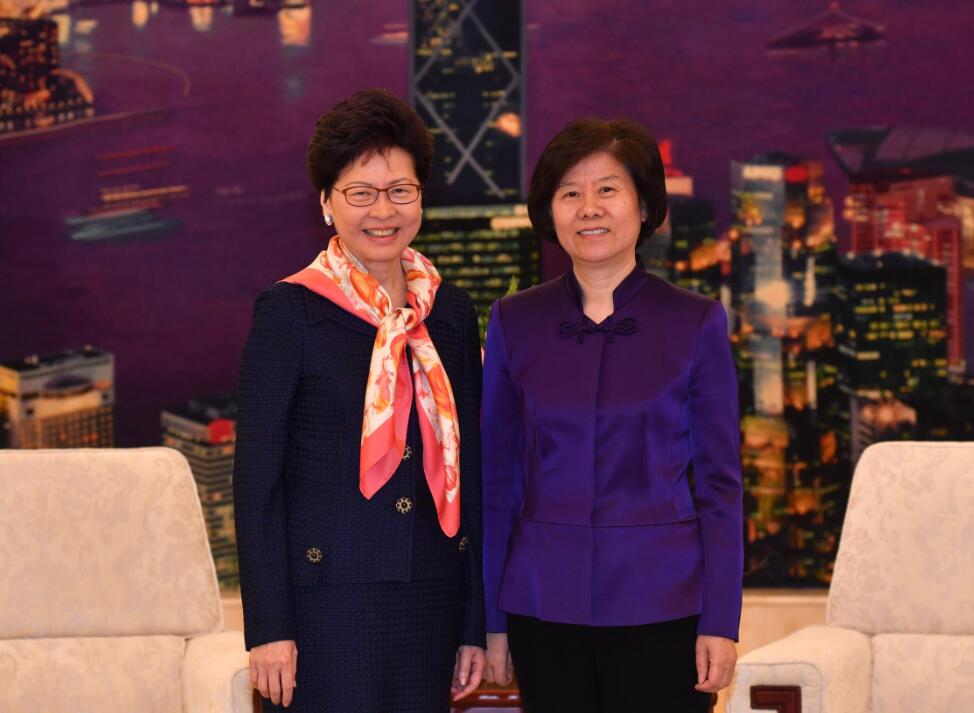 林鄭月娥(左)與中華全國婦女聯合會主席沈躍躍合照。