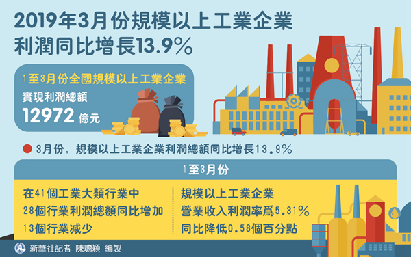 整體而言,1-3月份,中國規模以上工業企業實現利潤總額12972億元,同比下降3.3%,降幅比1-2月份收窄10.7個百分點。在41個工業大類行業中,28個行業利潤總額同比增加,13個行業同比減少。其中,專用設備製造業利潤總額同比增長超過30%,電氣機械和器材製造業同比增長超過20%。
