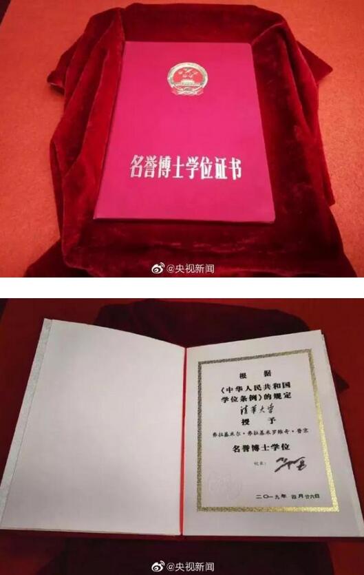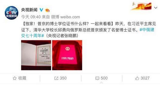 据@央视新闻 报道,昨天,在习近平主席见证下,清华大学校长邱勇向俄罗斯总统普京颁发了名誉博士证书。