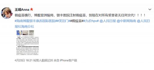 据界面新闻报道,4月23日,微博账号为@王曦Anna的用户在微博爆料,自己在海南博鳌银丰康养国际医院注射的九价HPV疫苗被认定为假疫苗,接种的同行人员中还有孕妇,因为自己投诉无门而到微博投诉。