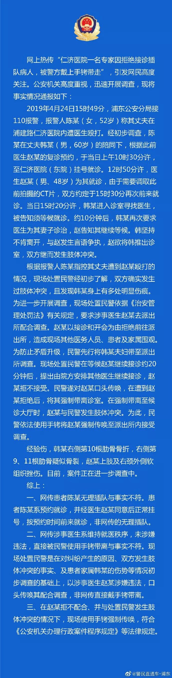 这两天,上海仁济医院胸外科主任赵医生因拒绝患者“插队”、被警察用手铐带走的新闻,引发了网友热议。